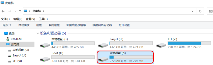 在ESP分区中选择盘符为Z盘,然后点击挂载ESP分区,会提示挂载成功